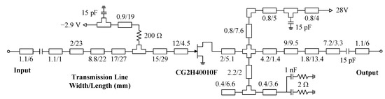 The broadband PA is designed based on the CG2H40010F transistor from Wolfspeed with a gate voltage of −3.0 V and a drain voltage of 28 V. The optimal load impedance of the utilized transistor at the internal plane is set to = 36 . The expected frequency range is 1.75–2.25 GHz (500 MHz). The 4350B substrate form Rogers corporation is utilized when designing the PA. The thickness of the substrate is 20 mil.