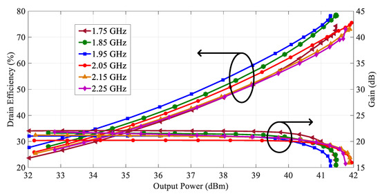 The simulated DE and gain of the broadband PA are illustrated in Figure 9. The designed PA is capable of delivering a maximum output power of 41.3–41.9 dBm over 1.75–2.25 GHz. And the designed PA achieves a saturation DE between 73.1% and 78.5%, along with a gain spanning from 15.1 dB to 15.9 dB, across the frequency band of 1.75 GHz to 2.25 GHz.