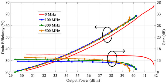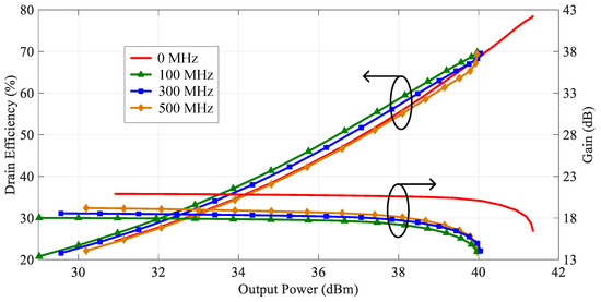 Secondly, to evaluate the performance of the fabricated PA, a two-tone CW signal, which is the same as in the simulation, is employed. The tone spacing of this concurrent two-tone CW signal is varied from 20 MHz up to 500 MHz. Figure 14 shows the measured concurrent DE and gain of the fabricated PA. The fabricated PA delivers a concurrent output power of 41.9 dBm when tone spacing is zero. Now, the measured DE and gain are 77.7% and 10.9 dB, respectively. Moreover, the measured concurrent output power remains above 39.6 dBm, and the measured concurrent DE exceeds 66.2% over a 500 MHz tone spacing.