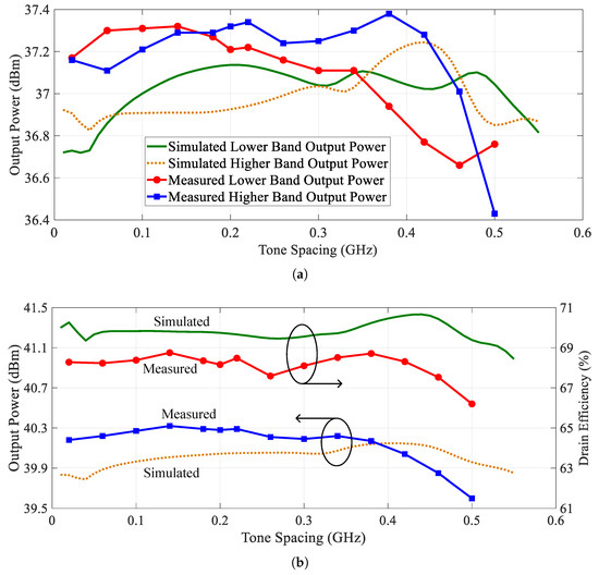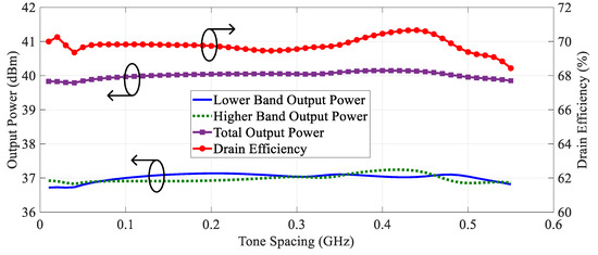 The simulated maximum concurrent output power and DE as a function of tone spacing are presented in Figure 11. The designed PA achieves a maximum concurrent output power changing from 39.8 dBm to 40.2 dBm over a 500 MHz tone spacing. The simulated maximum concurrent DE of the designed PA falls between 69.4% and 70.7% in the same tone spacing range. Moreover, Figure 11 also illustrates the simulated output power of the designed PA across both the lower and higher frequency bands. In the upper frequency band, the maximum output power of the PA ranges from 36.8 dBm to 37.2 dBm. And within the lower frequency band, the peak output power changes from 36.7 dBm to 37.1 dBm.