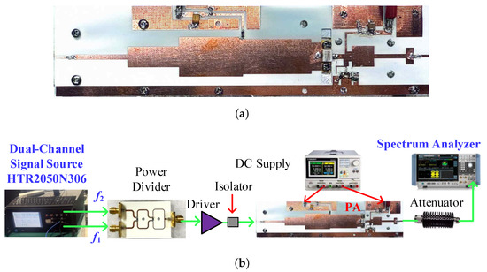 Figure 12a displays the photograph of the manufactured broadband PA. The testing setup for the broadband concurrent PA is illustrated in Figure 12b. Two signals at distinct frequency points are generated using a dual-channel signal generator. These signals are then combined together using a 1:1 power divider. Subsequently, the combined concurrent signal is directed to a driver to ensure sufficient power is delivered to the fabricated PA. To maintain a stable experimental environment, an isolator is placed between the driver and the fabricated PA. Both the driver and the fabricated PA are powered by a DC supply. After passing through a 40 dB attenuator, the output power of the fabricated PA is collected by a spectrum analyzer. During the testing, the drain and gate voltages of the PA are set to 28 V and −2.8 V, respectively.