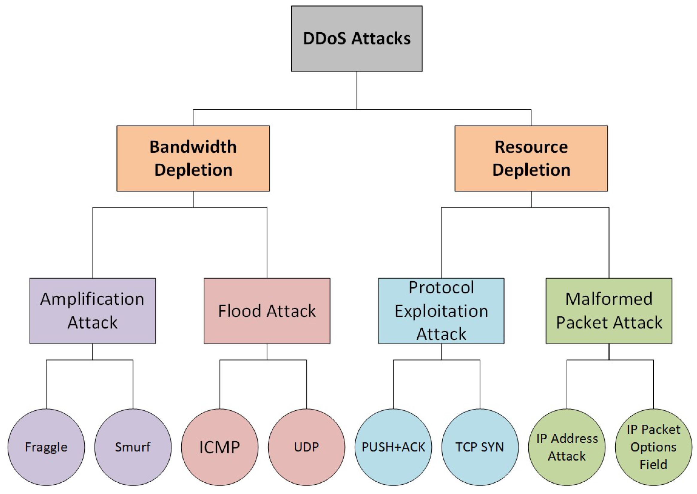 20]. (2) Resource depletion attacks (exhausting the victim system’s computational, memory, or protocol-handling resources, making it incapable of processing legitimate user requests). Its subtypes are Protocol Exploitation Attack and Malformed Packet Attack. In Protocol Exploitation Attack, the attacker identifies and takes advantage of flaws/weaknesses in network protocol, e.g., TCP SYN Flood, PUSH + ACK Attack, etc. [