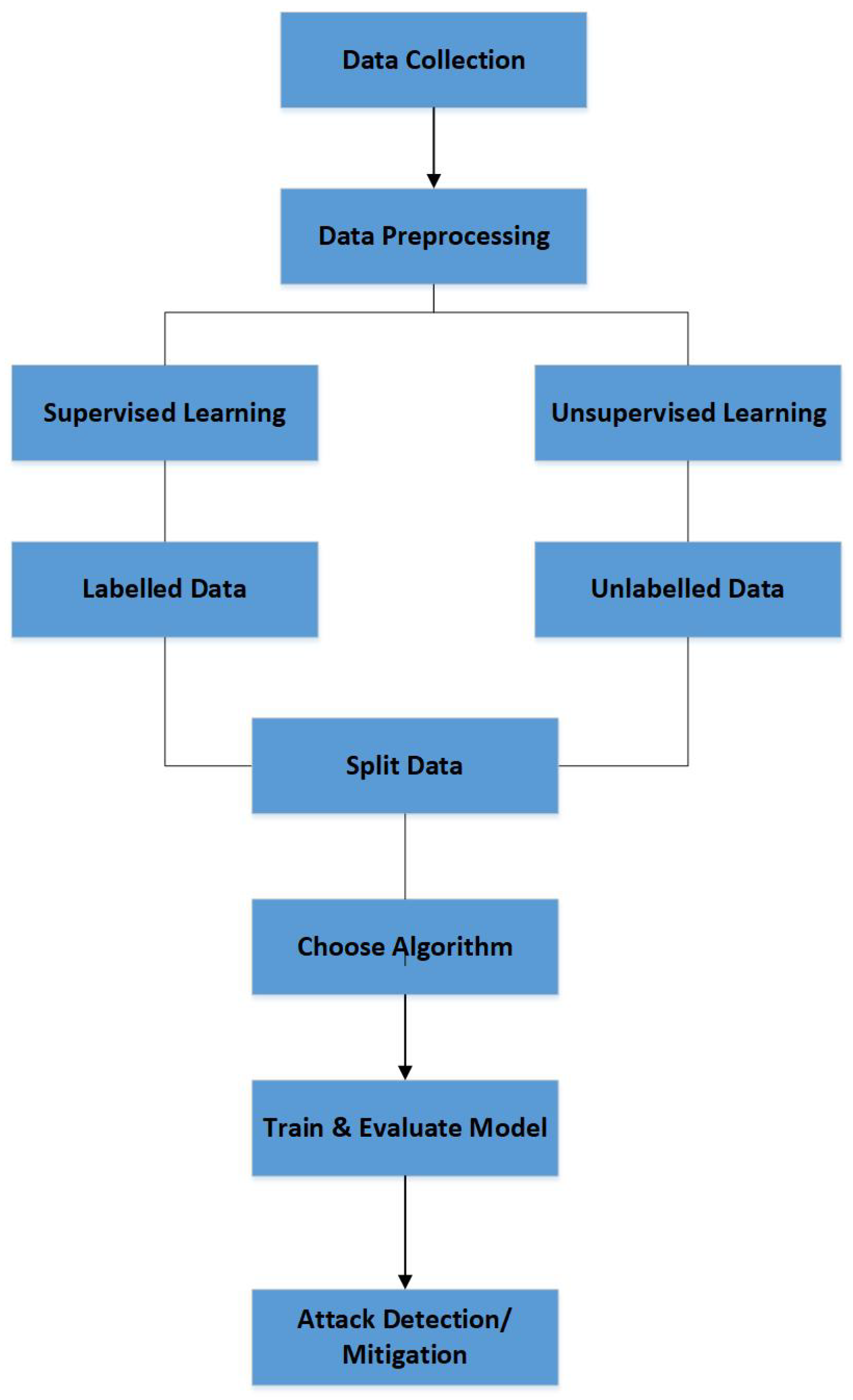 Figure 3 shows the machine learning workflow that begins with data collection. The next phase is preprocessing, which ensures that the dataset is clean and suitable for analysis. This phase often includes steps such as normalization, encoding, and, when necessary, data cleaning—which involves removing duplicate records and handling or discarding entries with missing values. The next step involves supervised learning and unsupervised learning. Supervised learning handles labeled data, while unsupervised learning treats unlabeled data. The process continues to split the data into training and testing sets by selecting an appropriate algorithm, trains the model, and then evaluates its performance on unseen data. For DDoS detection tasks, this typically involves classifying network traffic as either normal or attack. Then suitable actions such as alerts, blocking, or deploying mitigation strategies can be executed to safeguard the software-defined networking environment against identified attacks. For DDoS-specific datasets (e.g., CICDDoS2019, NSL-KDD, CAIDA), preprocessing usually entails flow reassembly to convert raw packet captures into bidirectional flow records, feature scaling (min–max or z-score normalization) to cope with skewed traffic volumes caused by attack floods, encoding categorical features such as protocol type, service, or flag values into numerical form, and removing artifacts, e.g., incomplete flows, duplicated SYN packets, or truncated attack bursts that occur during capture. These steps ensure that attack-induced anomalies (like high packet inter-arrival rates or abnormal byte counts) are kept intact as redundant data is minimized.