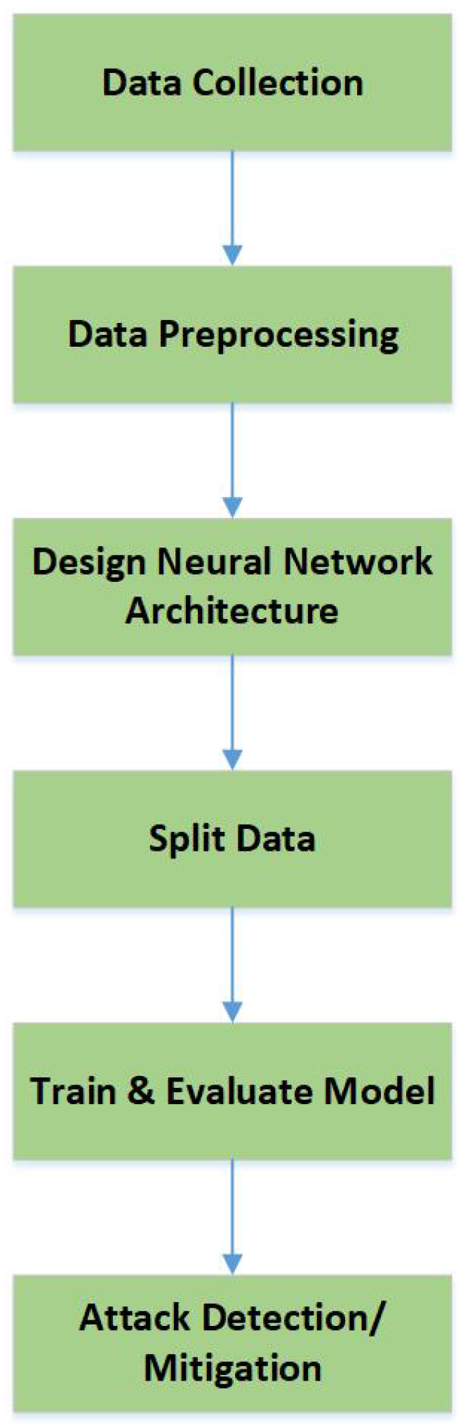 35]. Unlike conventional machine learning, deep learning requires the design of a neural network architecture, which may include multiple layers like convolutional, recurrent, or fully connected layers. Then data is split into training, validation, and test sets. During training, the model learns through forward propagation and backpropagation and adjusts weights. Following training, the model is evaluated using validation or test data to assess its performance. For DDoS detection tasks, this typically involves classifying network traffic as benign or malicious and mitigating them. For DDoS-specific detection, data preparation usually requires transforming raw flow statistics into traffic matrices or time-series windows to preserve temporal dependencies of attack bursts, applying one-hot encoding for protocol or port numbers in CNNs, handling class imbalance using oversampling (SMOTE) or undersampling, and selecting features tailored to DDoS traffic like packet rate per flow, entropy of source/destination IPs, or SYN-to-ACK ratios. These considerations boost the performance of deep learning models to capture both volumetric attacks like UDP floods and stealthy low-rate attacks like slow HTTP.