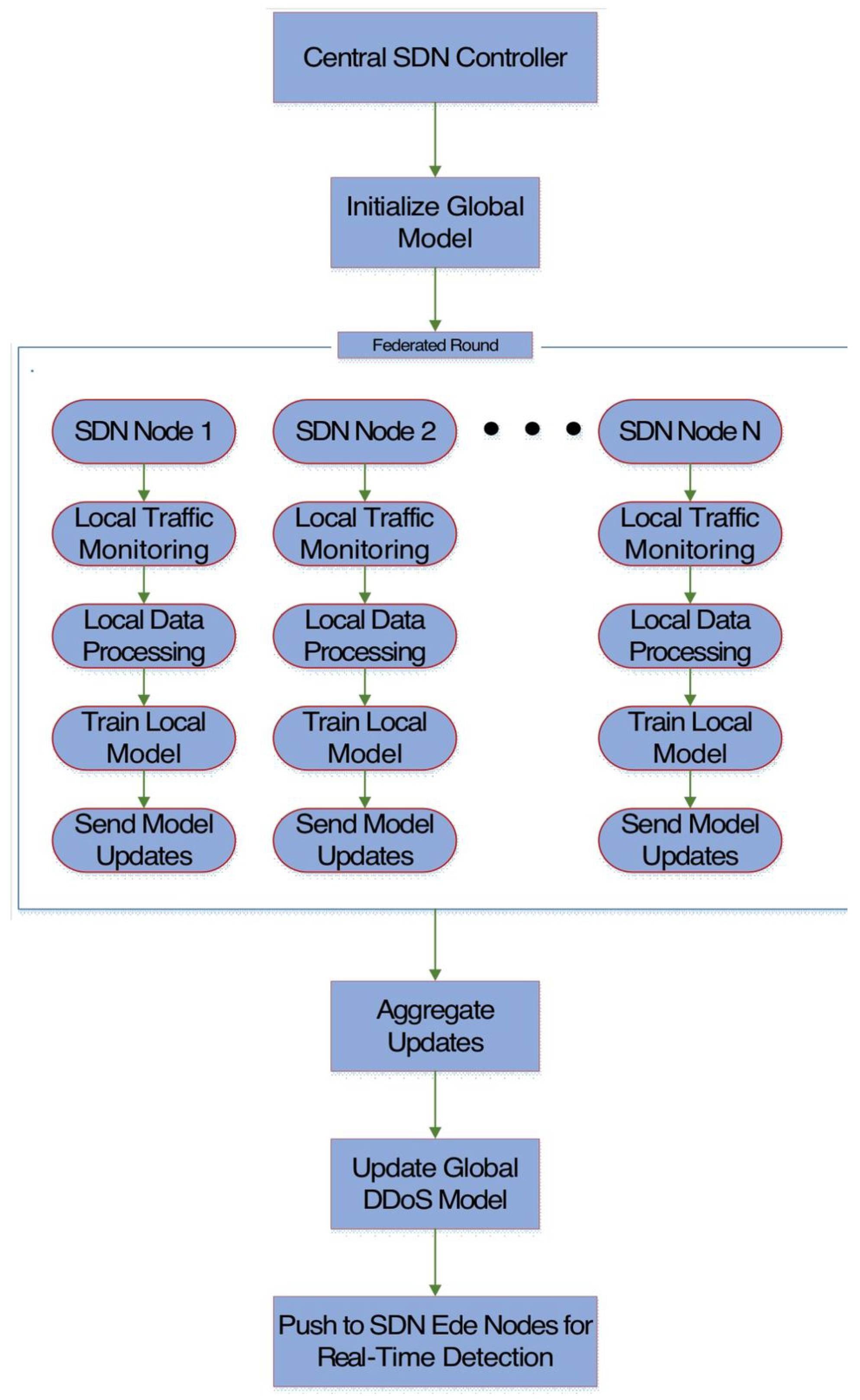 Figure 5 depicts the federated learning workflow in which each local node (distributed SDN switches/controllers) collects local traffic data (packet headers, flow stats, etc.) and independently trains a local model using its own data. Instead of sharing raw data, these nodes transmit only the model updates to a central server for aggregation. The server then combines these updates to form an improved global model that reflects collective insights from all participants and then the update global model is sent back to the edge nodes for real-time DDoS detection. This process reduces the data leakage risk, preserves data privacy and minimizes bandwidth usage by avoiding the transfer of large datasets [