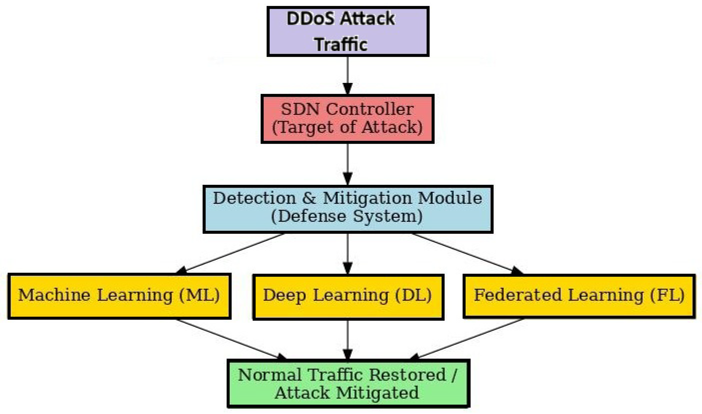Figure 6 illustrates the overall process of detecting and mitigating DDoS attacks in SDN. Malicious traffic first targets the SDN controller, where a defense module analyzes it using Machine Learning, Deep Learning, and Federated Learning approaches. These methods enable the system to identify and mitigate the attack, restoring normal network traffic.