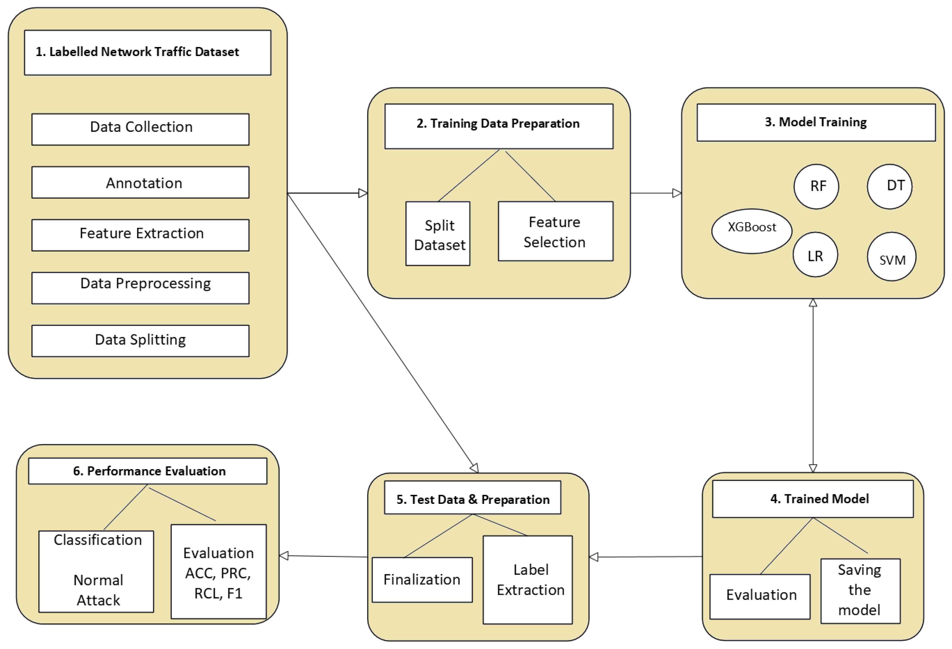 42] to detect DDoS attacks involves a supervised machine learning framework integrated with a custom dataset. Mininet emulator was used. The authors first designed realistic SDN topologies and simulated both benign and attack-based traffic by using tools like MGEN and hping3. Network traffic was captured and processed into flow-level features. These features were then subjected to preprocessing. Five machine learning classifiers, LR, SVM, RF, KNN and XGBoost, were trained and tested on the dataset. The proposed framework is shown in