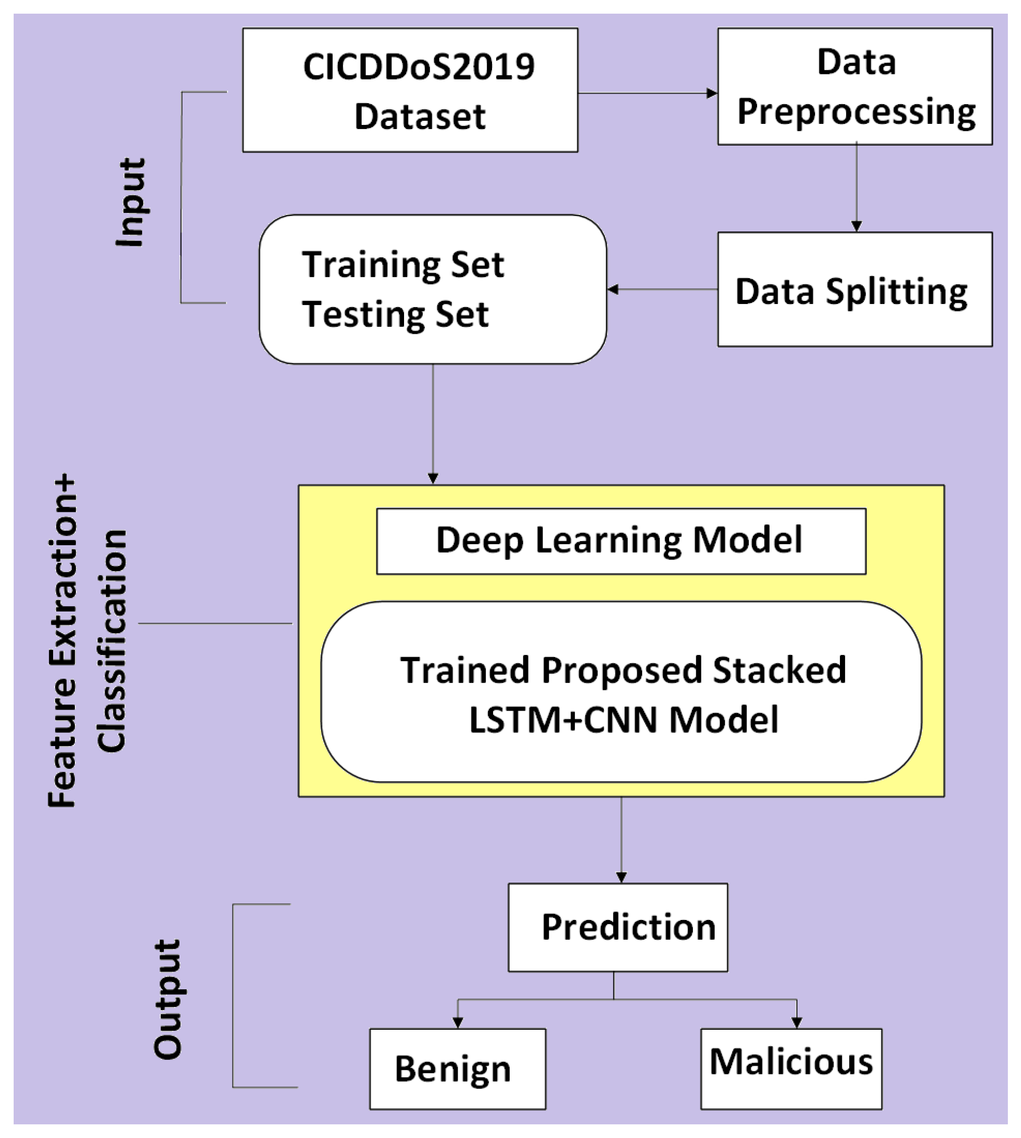 Figure 9. It is a hybrid deep learning approach, combining CNN and Bidirectional Long Short-Term Memory (BiLSTM) model. Initially, network traffic data is collected and preprocessed using the CICDDoS2019 dataset. The CNN component is employed to extract local spatial features from the input traffic data, while the BiLSTM network captures temporal dependencies and contextual information from the sequence of network events. This combined architecture improves the model’s ability to accurately identify patterns similar to DDoS attacks. Though limited to detection only, it does not explore real-world mitigation deployment and is only tested on one dataset.