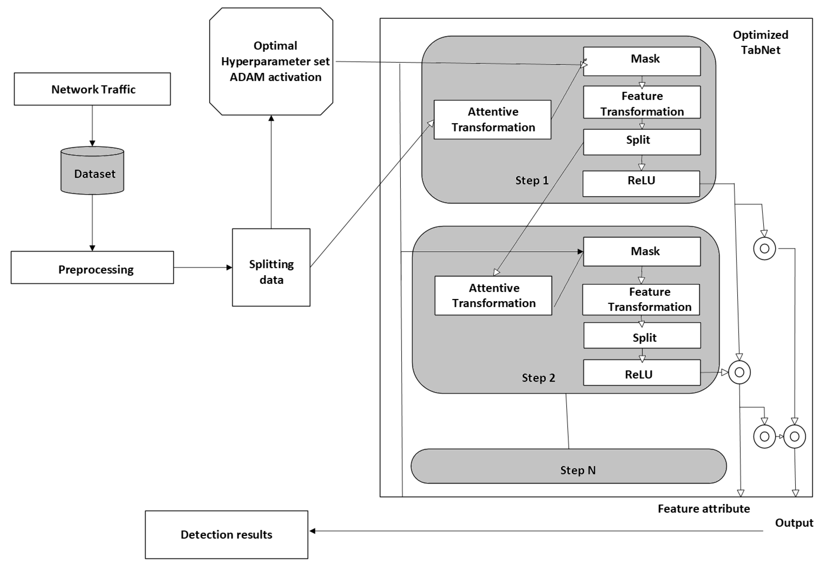 Figure 10. It involves an optimized deep learning model called TabNet, enhanced with Adam optimization and hyperparameter tuning by using Grid Search Cross-Validation (GSCV). This approach processes tabular network traffic data, leveraging TabNet’s feature selection and sequential decision-making capabilities to identify attack patterns. The model dynamically adjusts learning rates and employs limited attention mechanisms to focus on suitable features and achieve high accuracy. However, datasets might not fully represent real-world VANET diversity and limited adversarial testing.