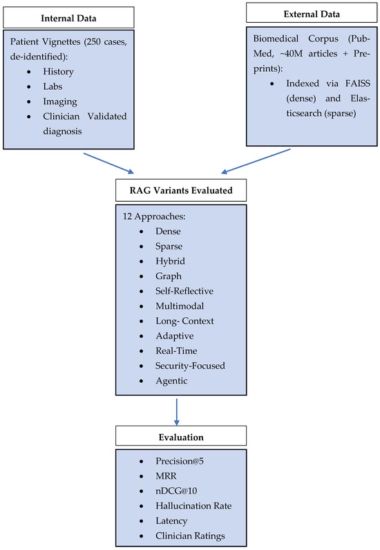 The design of this study aimed to evaluate how different Retrieval-Augmented Generation (RAG) variants perform in real-world clinical decision support. To achieve this, we combined carefully curated clinical evaluation data with large-scale biomedical literature as the retrieval corpus. This section describes the data sources, system architecture, experimental setup, and evaluation procedures that were used to assess twelve RAG approaches.