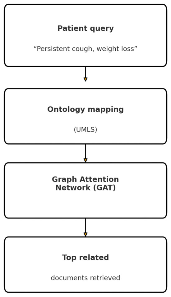 Our UMLS graph comprised ~3 M CUI nodes and 15 M relations. We implemented meta-path-based scoring where semantically relevant relation types (e.g., “associated_with”) were weighted via learned attention scores from a Graph Attention Network (GAT) [17,48]. The GraphWalker algorithm used beam-search with beam size = 5 to explore the most promising subgraphs, retrieving passages connected within two hops. To incorporate document relevance, passage nodes carried precomputed BM25 and dense similarity attributes influencing path scores (Figure 3).