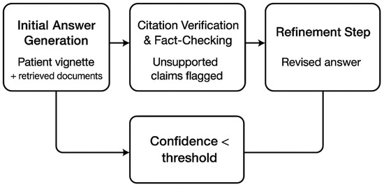A composite hallucination reduction framework that included retrieval confidence thresholding (cosine similarity ≥ 0.65) to filter low-relevance passages [8,53], chain-of-thought verification enforcing explicit PMID citations [9,56], external fact-checking with SciFact to reject unsupported claims [32], Monte Carlo dropout during generation (p = 0.1) for uncertainty estimation and abstention on low-confidence outputs [57], calibrated softmax outputs aligning token probabilities with empirical accuracy [21,58] and self-reflective prompts instructing the model to admit uncertainty when evidence was insufficient [51] was used to ensure clinical safety and answer reliability.