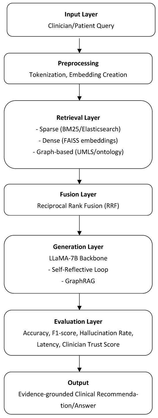 Overview of the multi-layered clinical question-answering pipeline. Each layer—from query input through preprocessing, retrieval, fusion, generation, and evaluation—contributes to producing an evidence-grounded clinical recommendation or answer.