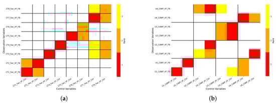 Permutation importance heatmaps showing data-driven causal influence between control variables and feedback signals. The horizontal axis represents control variables, and the vertical axis represents observable variables. Black lines separate different equipment groups. The color scale in the figure indicates the relative causal influence rankings, color intensity indicates importance: red for strongest, orange for second-strongest, and yellow for third. (a) Variable frequency control of cooling tower fans and corresponding feedback signals. (b) Variable frequency control of water pumps and corresponding feedback signals.