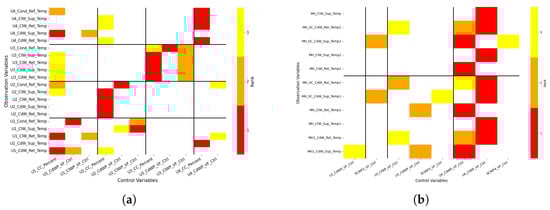 Permutation importance heatmaps showing data-driven causal influence between control variables and temperature observables. (a) focuses on temperatures within individual units, while subfigure (b) examines temperatures along the main header. The horizontal axis represents control variables, and the vertical axis represents temperature measurements. Black lines separate different equipment groups. The color scale in the figure indicates the relative causal influence rankings, color intensity indicates importance: red for strongest, orange for second-strongest, and yellow for third. (a) Permutation importance: control variables vs. unit-level temperature observables. (b) Permutation importance: control variables vs. main header temperature observables.