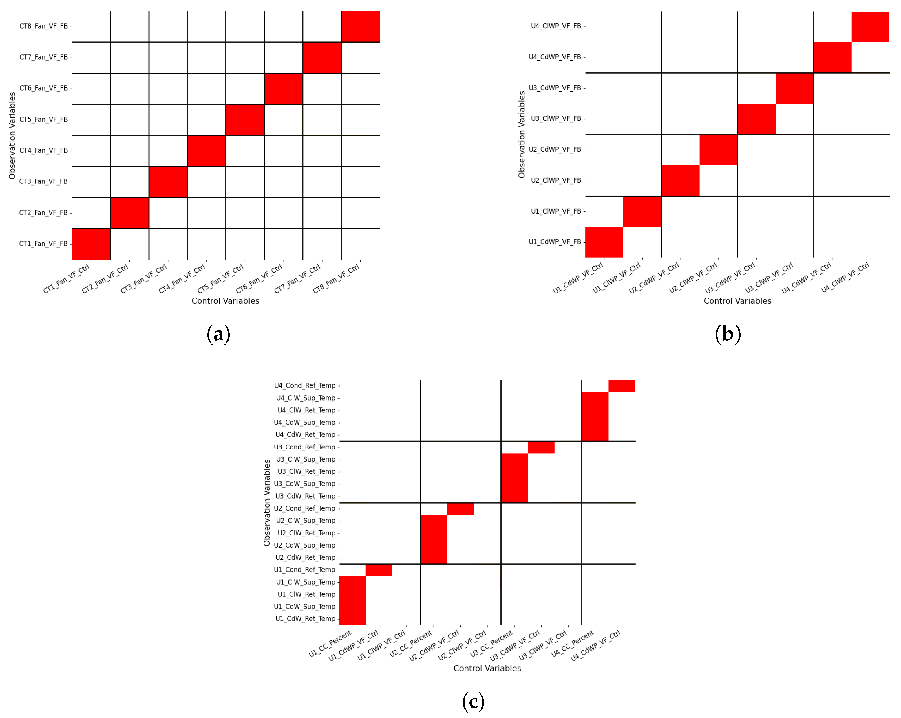 Physics-informed prior relationships between control and observable variables. The horizontal axis represents control variables, and the vertical axis represents observable variables. Black lines delineate different equipment groups, while red highlights indicate the primary influencing control variable for each observable. (a) Cooling Tower Fan Control vs. Feedback Signals. (b) Water Pump Control vs. Feedback Signals. (c) Control Variables vs. Water Temperature Across System Zones.