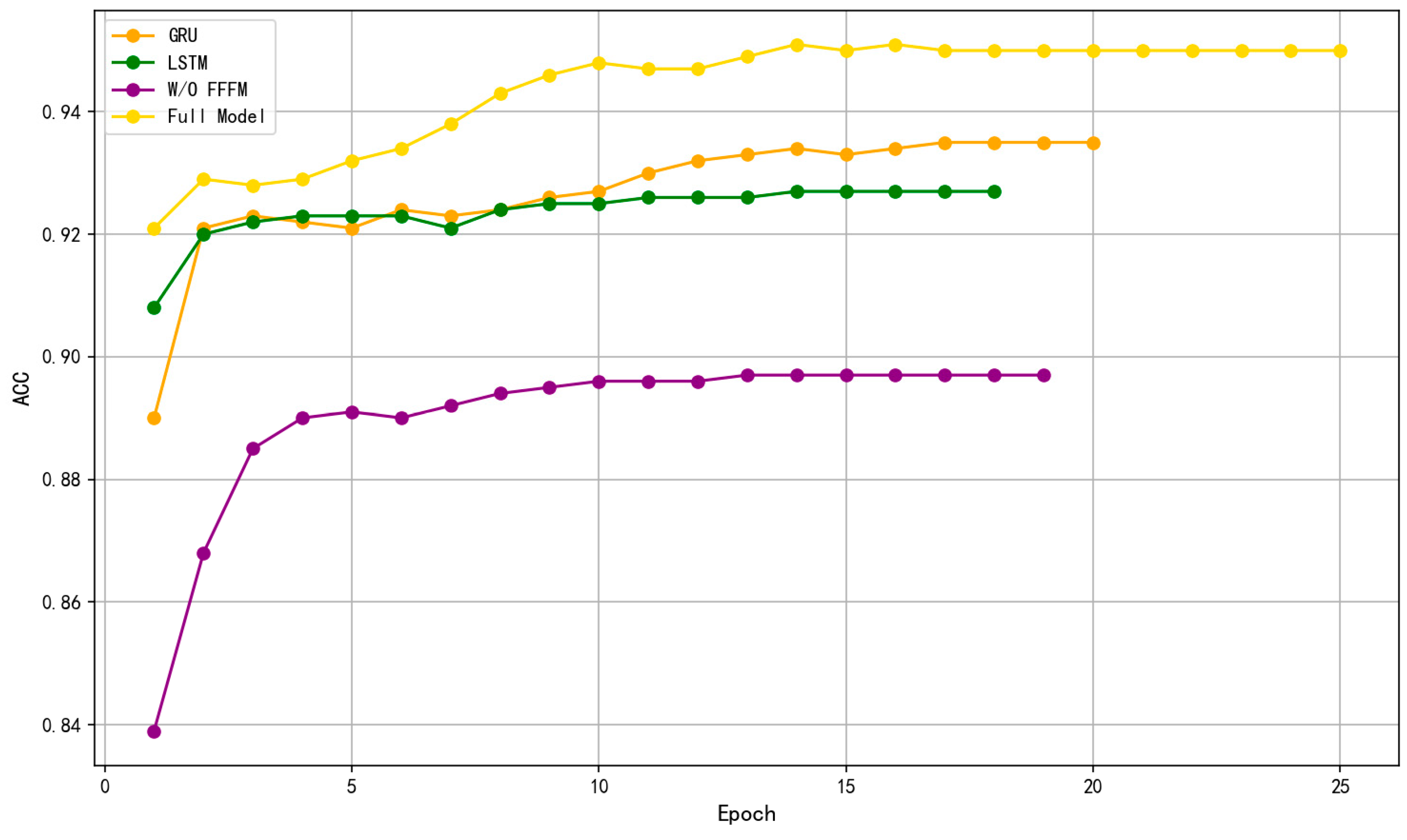 - The w/o FFFM model achieves the lowest training ACC, approximately 89%, and exhibits the slowest convergence. This highlights that relying solely on packet-level features is insufficient to capture temporal dependencies, particularly in the presence of dispersed or covert attacks.