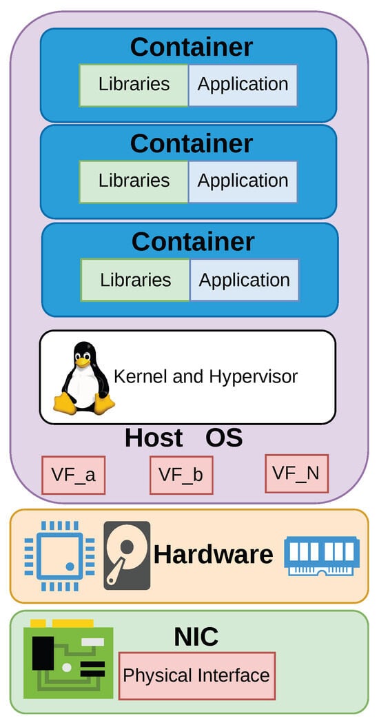 Figure 1. Within network slicing architectures, containers permit agile, lightweight, and scalable deployment of network functions. Unlike VMs, containers provide process-level isolation with minimal overhead, allowing for faster instantiation, reduced resource consumption, and improved portability across heterogeneous environments [