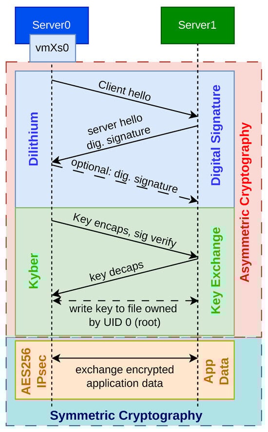 Figure 3. Typically, establishing communication between two parties involves three main steps: first, the exchange of digital signatures; second, the negotiation of a shared secret key; and finally, the transmission of application data. The first two steps (digital signature and key exchange) rely on asymmetric cryptography. Digital signatures are used to verify identities, allowing a server to prove its authenticity. Optionally, the server can request that the client also authenticate itself via a digital signature.