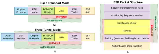 Internet Protocol security (IPsec) is a widely adopted protocol suite designed to provide secure communication at the IP layer through mechanisms such as authentication, data integrity, and encryption. The packet structure of IPsec and the overview of the ESP header, for both transport and tunnel modes, can be seen in