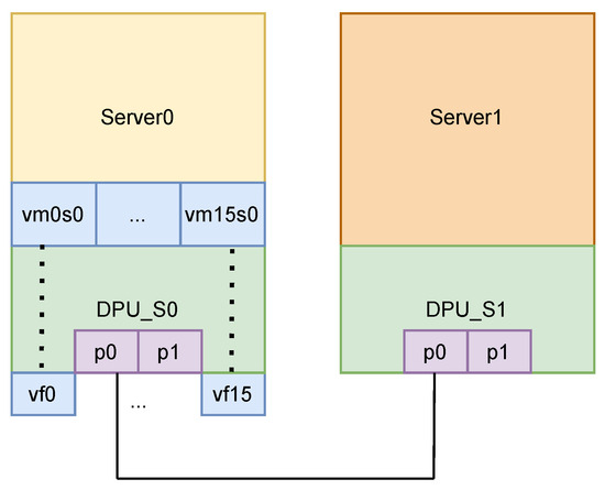 The experiment was structured to compare three distinct offload modes in NIC mode, and a software-centric mode in DPU mode, for different server–client(s) scenarios. For both of these modes and scenarios, we also provide as a baseline of the actual line-rate performance we achieved. In this case we have an insecure communication channel (no cryptography between the (v)hosts. However, we believe that this baseline is important, as it showcases the added computational/network complexity that gets added into the system. In NIC mode, the DPU’s ARM cores were disabled, and the host system interacted with the DPU as a high-performance Network Interface Card. In NIC mode, the three offload modes tested were (1) no offload, in which all IPsec processing—including encryption, decryption, and ESP encapsulation—was handled by the host CPU; (2) crypto offload, where only the cryptographic operations were offloaded to the DPU hardware, while ESP encapsulation remained in software; and (3) packet offload, where the entire ESP packet processing, including both cryptography and encapsulation, was performed in the DPU hardware, making the offload completely transparent to the host. Each of these modes was tested with both TCP and UDP traffic, using the maximum MTU size, and with a variety of parallel streams to simulate real-world traffic patterns.