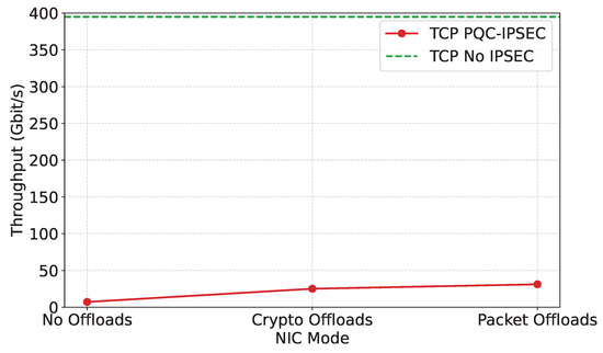 For each test, the host system’s IPsec SAs and policies were configured using the Linux iproute2-6.11.0 utility, with the appropriate offload flags (no offload, crypto offload, packet offload) set to control the behavior of the DPU. The PQC handshake and key management were orchestrated using custom scripts. Traffic generation was performed using iperf3, with careful attention paid to the number of parallel connections, the packet size, and the duration of each test. Throughput was measured as reported by iperf3, while CPU utilization was monitored using mpstat and system resource monitors. Hardware offload activity was confirmed by querying DPU counters via ethtool-S and inspecting sysfs/debugfs entries for ESP and IPsec statistics.