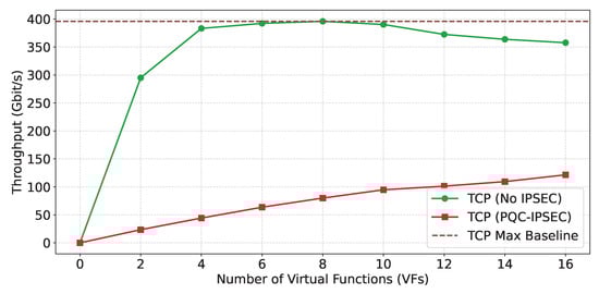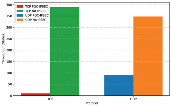 Figure 9, we provide the host-to-host bar plot for TCP and UDP for PQC-IPsec and for the line-rate baseline performance. PQC-IPsec over TCP performs poorly, achieving only 9.64 Gbit/s compared to the unencrypted line-rate baseline of 389.85 Gbit/s. This is a mere 2.47% utilization of the line-rate performance. On the contrary, UDP showcases tolerable performance, achieving 89.49 Gbit/s compared to the 347.93 Gbit/s baseline or 25.72% utilization of the line-rate. We will now present the real performance benefits of QRoNS, which can be especially observed for the VFs-to-Host configuration.