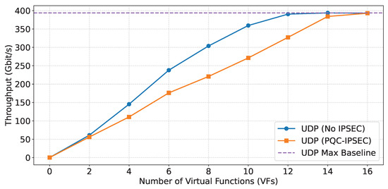 The experimental results of the DPU mode VF-to-host configuration reveal a clear distinction in performance between TCP and UDP when using PQC-IPsec in a virtualized environment. For TCP, the achieved throughput remains a relatively small fraction of the line rate, starting at just 8% with 2 VMs and gradually increasing to 34% with 16 VMs. This progression reflects the significant overhead imposed by TCP’s connection-oriented nature and the additional cryptographic processing required for quantum-resilient security. In contrast, UDP demonstrates much higher efficiency, with utilization rates consistently above 70% for most VM counts and ultimately reaching 99.9% at 16 VMs. This stark difference underscores how UDP’s stateless and lightweight design, combined with effective hardware offloading, enables it to approach line-rate performance even under the demands of PQC-IPsec. These findings highlight that, while quantum-resilient security is feasible for both protocols, UDP is far better suited for high-throughput, latency-sensitive applications in virtualized and sliced network environments. The results also suggest that further hardware acceleration and protocol optimization could help close the gap for TCP, but the inherent protocol overhead will likely remain a limiting factor.