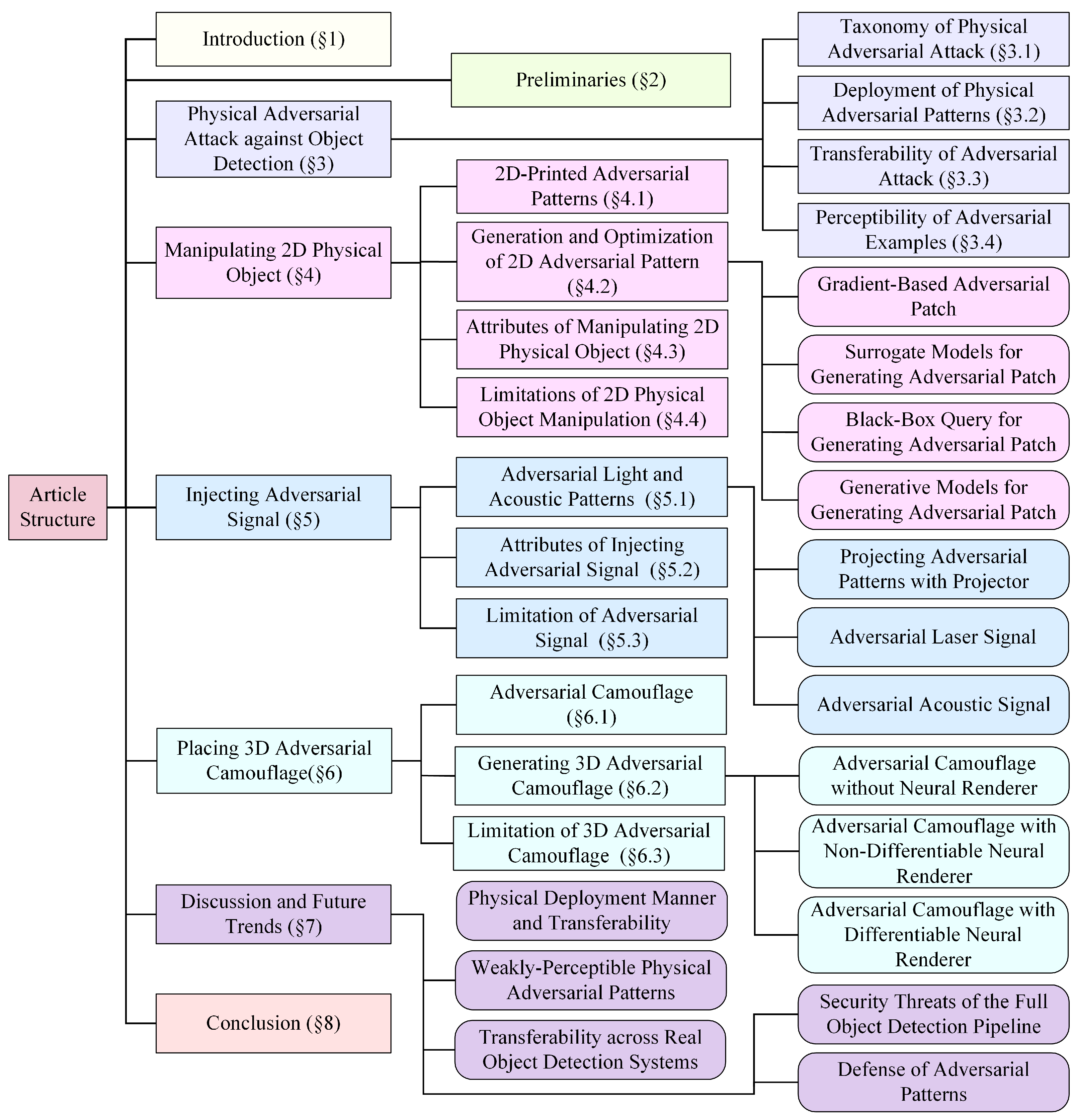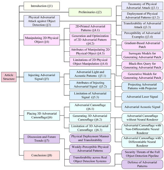 This review is organized as follows: Section 1 introduces the scope of the reviewed literature and the academic databases used for the literature search. Section 2 presents a number of preliminaries. Section 3 delineates the taxonomy of physical adversarial attacks against object detection (Section 3.1), the deployment of physical adversarial patterns (Section 3.2), the transferability (Section 3.3) of adversarial attacks, and the perceptibility of adversarial examples (Section 3.4). Section 4, Section 5, and Section 6 introduce three types of attack in turn: manipulating 2D physical objects, injecting adversarial signals, and placing 3D adversarial camouflage. Section 7 offers detailed discussion of the trade-offs between transferability, perceptibility, and deployment manners, along with their limitations and future trends. Finally, Section 8 presents the conclusion. The entire structure of this article is shown in Figure 1.