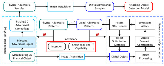 A schematic diagram of physical adversarial attacks, including the manipulation of physical adversarial patterns to generate physical adversarial examples and the generation and optimization of digital adversarial patterns. We can easily compare and contrast to see where the contributions are and what it missing to build effective physical or digital adversarial attacks.