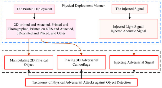 The taxonomy of physical adversarial attacks against object detection: (1) Manipulating 2D physical objects; (2) Injecting adversarial signals; (3) Placing 3D adversarial camouflage. The blue dashed boxes represent the physical deployment methods of adversarial patterns; the black dashed boxes represent the types of physical adversarial attacks; the brown solid arrows indicate the correspondence between the deployment manners and the physical attacks.