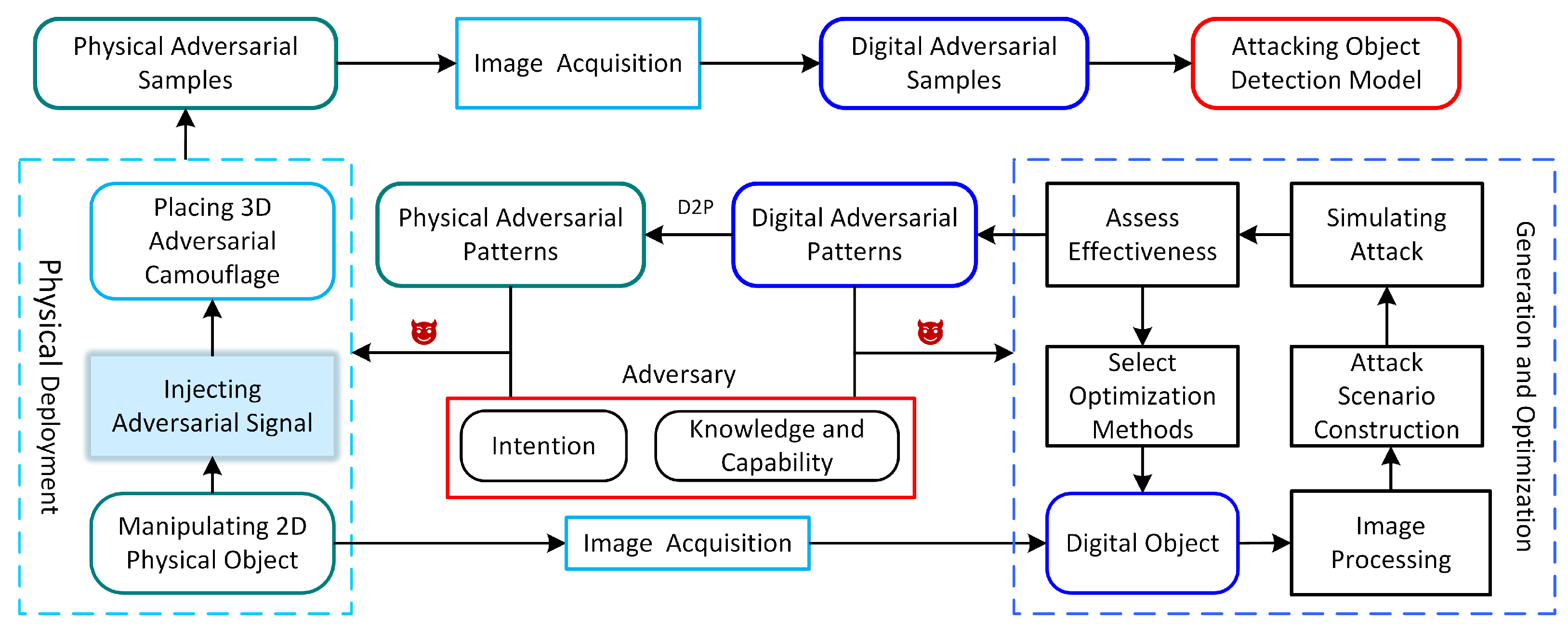 Following the generation process of digital adversarial patterns, the digital attack consists of six key steps: digital object manipulation, digital image processing, attack scenario construction, attack simulation, effectiveness assessment, and selection of optimization methods. The objective is to generate optimized digital adversarial patterns.