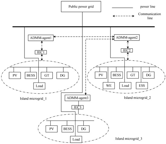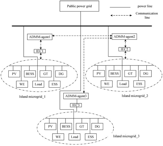 However, as the proliferation and scale of microgrids escalate, the imperative to effectively manage and optimize these distributed energy systems has risen to a pressing challenge [3]. Traditional centralized energy management methodologies, cumbersome with their prerequisite for substantial communication and computational resources, struggle to meet the demands of large-scale distributed systems. Consequently, distributed energy management strategies have emerged as a burgeoning focal point within the research community. Among these, the alternating direction method of multipliers (ADMM) stands out as an effective distributed optimization algorithm, widely employed for its remarkable efficiency and convergence properties in addressing large-scale optimization issues. The ADMM’s approach involves the decomposition of the overarching problem into multiple sub-problems, addressed in parallel, with iterative global variable updates to converge upon the global optimum solution. This method is particularly adept at handling distributed energy management challenges, as it facilitates optimal system scheduling while safeguarding the privacy of each microgrid [4,5].