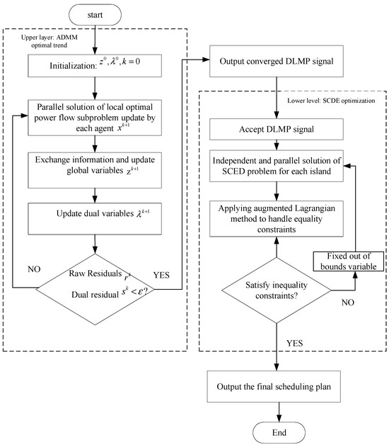 As shown in the overview, the algorithm flow is shown in Figure 2, which is divided into two parts: upper-level ADMM optimal power flow and lower-level SCDE optimization. The specific steps are as follows: