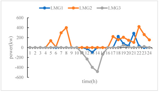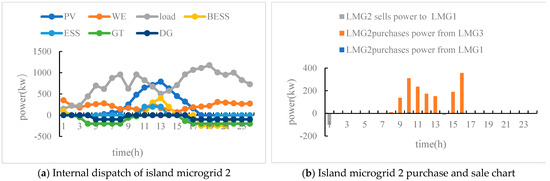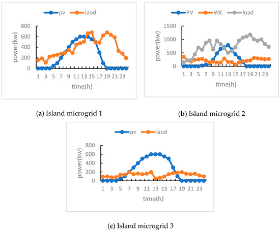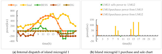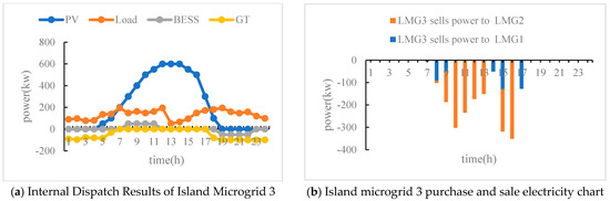 From Figure 8, we can see that the load of island microgrid 1 and 2 is relatively high, and the main power generation equipment supplies energy to the load. Moreover, there will be a significant load gap in the evening (approximately from 17:00 to 22:00), and power can only be purchased from the higher-level grid. Island microgrid 3 can be used as a power supply microgrid. Between 13:00 and 14:00, the maximum photovoltaic power generation occurs. When sold to other island microgrids, the remaining electricity is sold to the higher-level grid for profit.