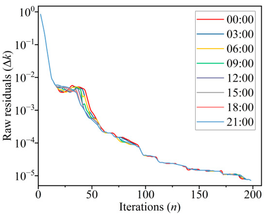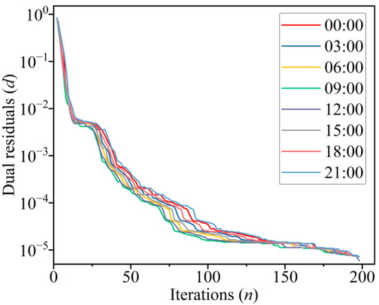 Due to the randomness of the load demand of the microgrid and renewable energy generation, it will affect the solution of the optimal scheduling plan to a certain extent, and also affect the convergence of the algorithm in this paper. In order to analyze the convergence of the proposed algorithm, the raw residuals and dual residuals of each period are recorded, and the range of the raw residuals and dual residuals is set to 0.001. In Figure 9 and Figure 10, each line represents a period of time with an interval of 3 h. After about 150–200 iterations, the above two residuals converge to the expected value, indicating that the proposed algorithm has good convergence.