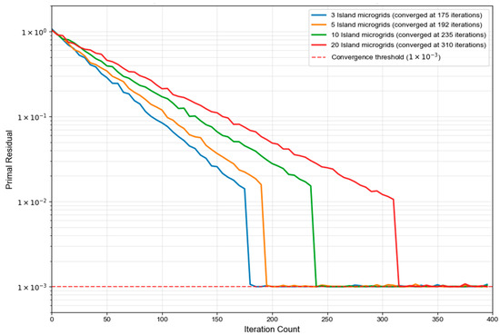 To verify the applicability of the proposed algorithm in large-scale systems, this section tested its scalability. On the basis of the original three-island microgrid system, a testing system consisting of 5, 10, and 20 island microgrids was constructed by copying and fine-tuning parameters. The algorithm performance is shown in Figure 11 and Table 7.