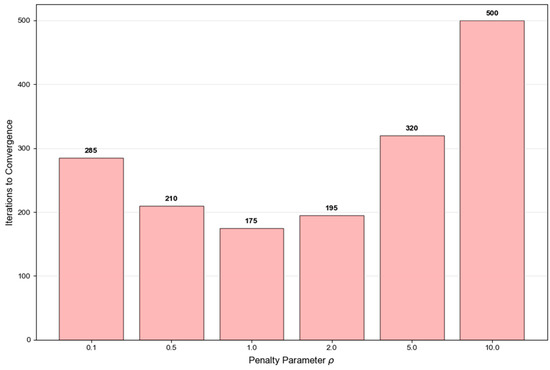 Figure 12 analyzes the impact of penalty parameter ρ on the convergence speed of the ADMM algorithm using this bar chart. The convergence performance of ρ was tested within the range of 0.1 to 10.0, and the results showed that when ρ = 1.0, the convergence speed was the fastest, requiring only 175 iterations. When ρ deviates from the optimal value, the convergence performance significantly decreases. When ρ = 0.1, 285 iterations are required, and when ρ = 10.0, convergence is even impossible.