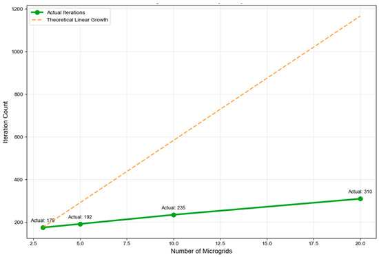Figure 14 compares the trend of actual iteration times with theoretical linear growth, verifying the scalability of the algorithm. The actual number of iterations increased from 175 for 3 microgrids to 310 for 20 microgrids, far below the theoretical linear growth expectation. Specifically, the system size increased by 6.67 times, but the number of iterations only increased by 1.77 times, showing a clear sub linear growth characteristic. This excellent scalability proof algorithm is applicable to large-scale multi-island microgrid systems and provides a theoretical basis for practical engineering applications.
