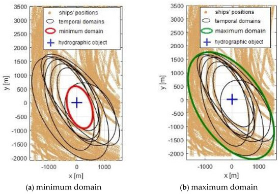 The domains of the hydrographic object for different ship size classes were compared. The maximum domains of the point object for very large and large ships were similar in shape and reflected the size relations of the ships (the domain for very large ships is larger than the domain for large ships (Figure 14). Attention is paid to the relationship between the domains of medium and small ships.
