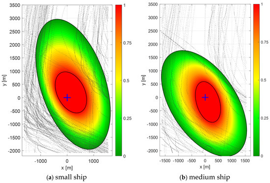 The medium domains of the point object for medium and small ships were similar in shape and reflected the size relations of the ships (the domain for very large ships is larger than the domain for large ships (Figure 15). Similar relationships were observed for medium and small ship domains.