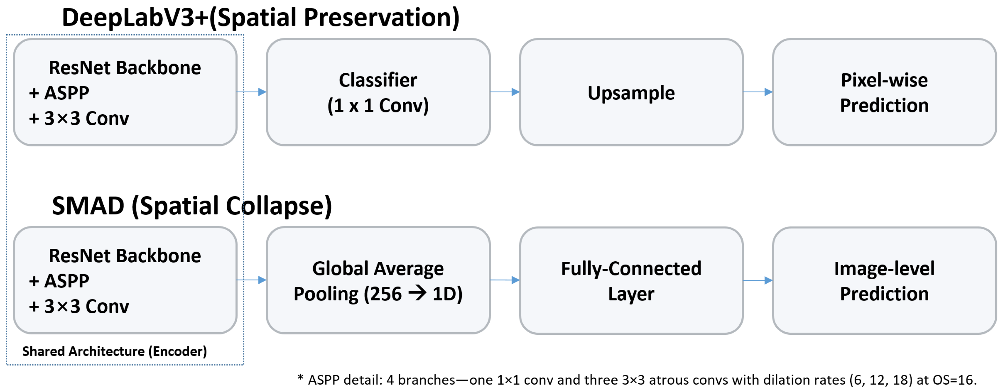 - A semi-supervised detector with segmentation-derived pixel-level features. We introduce SMAD, which couples dual-branch consistency with a segmentation-oriented backbone that extracts dense, pixel-level, multi-scale representations from APK imagery via an Atrous Spatial Pyramid Pooling (ASPP) module. These features combined with agreement between parallel branches provide higher-SNR unsupervised targets—improving early calibration, training stability, and label efficiency under label scarcity.
