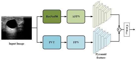 The overall workflow is as follows. The input image is simultaneously fed into both branches. In the ResNet50 branch, the convolutional backbone extracts multi-scale feature maps, which are then enhanced by an asymptotic feature pyramid network (AFPN) [24] to facilitate better cross-scale fusion. In the PVT branch, the transformer backbone captures global contextual information and generates its own set of multi-scale features, which are refined by a standard feature pyramid network (FPN) [25].