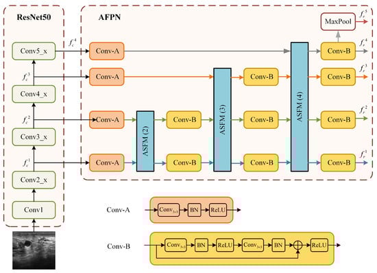 The structure of the ResNet50 branch, which integrates the ResNet50 backbone with the AFPN is illustrated in Figure 3. This branch is designed to address the challenge of large tumor scale variation in ultrasound images by constructing a powerful multi-scale feature representation. Relying solely on single-scale or the native multi-scale features from ResNet50 is often insufficient for this task.