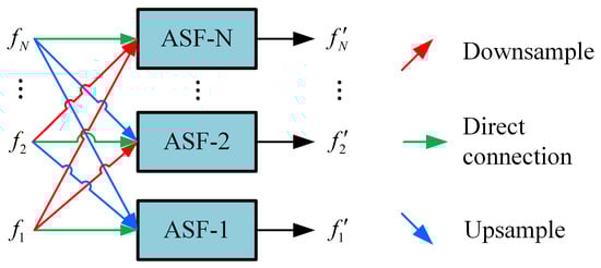 These feature maps are then processed by the AFPN. The AFPN first uses two specific convolution blocks (denoted as Conv-A and Conv-B in Figure 3) to prepare the features. The core of the AFPN is composed of several adaptive spatial fusion modules (ASFM). The architecture of a general N-scale ASFM is detailed in Figure 4. Each ASFM contains a number of adaptive spatial fusion (ASF) blocks [26] equal to the number of input feature scales, N.