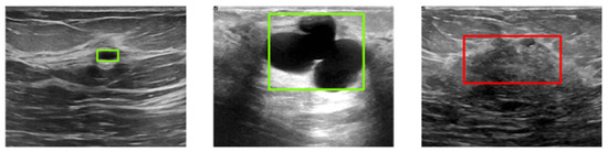 Sample images from the BUSI dataset with ground-truth bounding boxes. Benign and malignant tumors are annotated with green and red boxes, respectively.