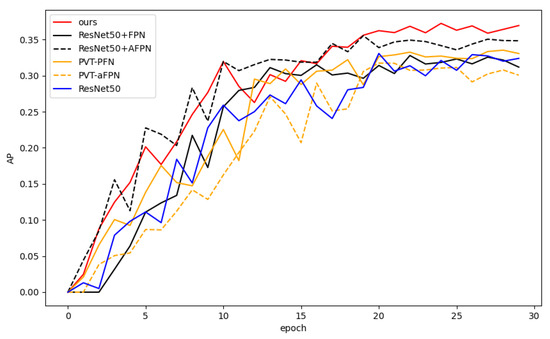 Since the performance of PVT is closely related to the network depth, an ablation study was conducted on the scale of the PVT branch. Four scales of PVT—Tiny, Small, Medium, and Large—were investigated, corresponding to different numbers of transformer encoder layers in each stage (as detailed in [21]). As shown in Table 2, the detection performance improves significantly as the network scale increases, with the Large-scale PVT (3, 4, 27, and 3 encoder layers in the four stages) achieving the best overall accuracy.