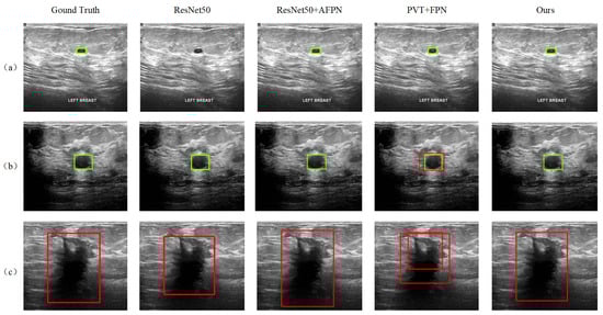In addition to the quantitative AP-based evaluation, the detection results of the proposed method are also visualized and qualitatively analyzed. It is shown that our model is better at detecting tumors of different scales and properties. Figure 8 shows the results of some sample images, where samples (a) and (b) contain benign tumors with large-scale differences, marked by the green boxes, while sample (c) contains a malignant tumor, marked by the red boxes. The detection results of the three reference models, ResNet50, ResNet50+AFPN, and PVT+FPN, that performed better in Table 1 are also given in the figure. The ResNet50 model fails to detect the small benign tumor in sample (a). In sample (b), although all models successfully detected the benign tumor, the PVT+FPN model additionally detected a malignant tumor in almost the same (slightly larger) location, resulting in a contradictory result. The introduction of AFPN into ResNet50 effectively improves the detection performance, and the ResNet50+AFPN model achieves correct results in all three samples (see the third column). In contrast, the DETR model performs less effectively in detecting large malignant tumors, often producing overly broad bounding regions that reduce localization precision when compared with our method. Compared to ResNet50+AFPN, our model demonstrates more accurate tumor localization.