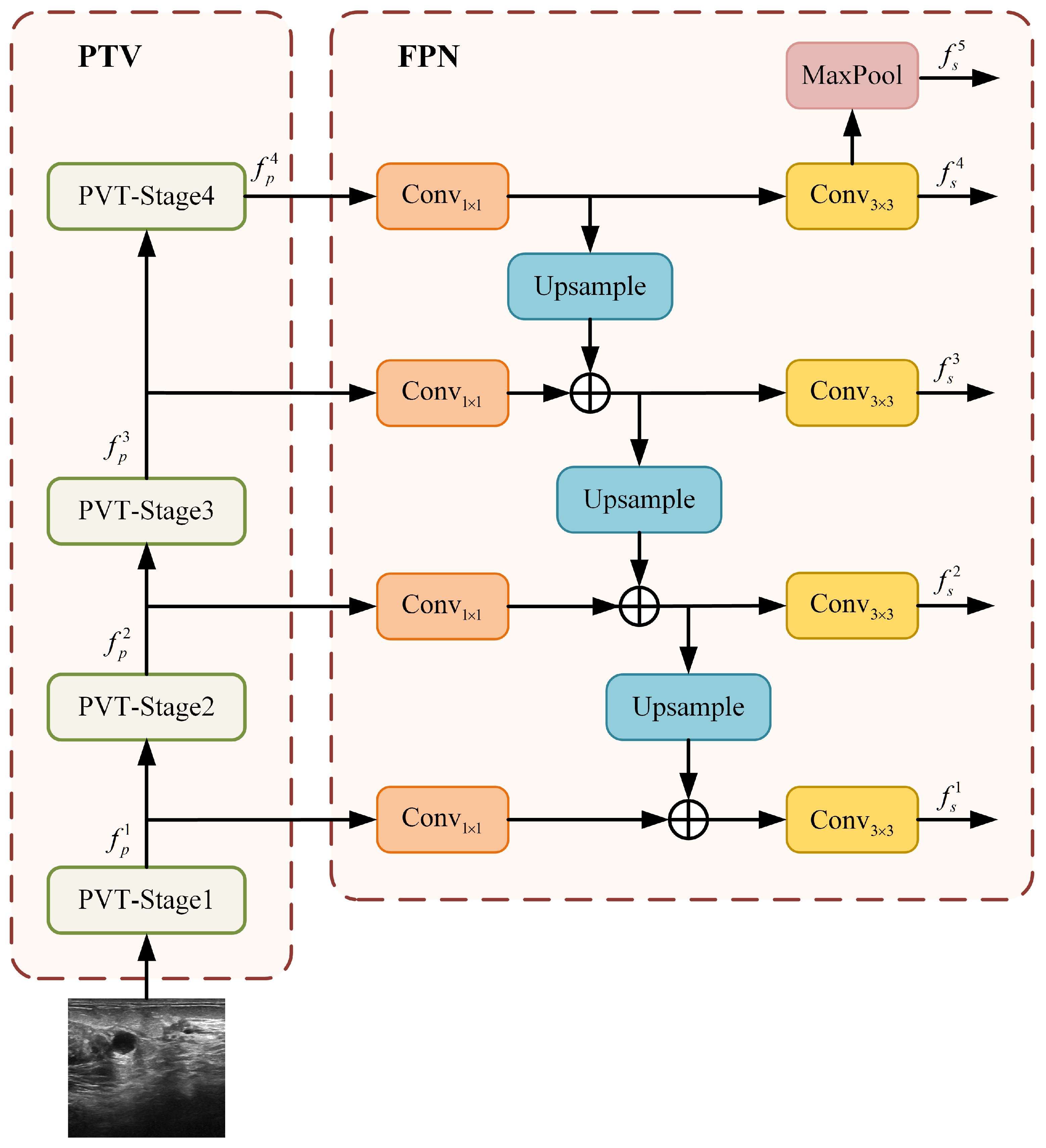 Figure 5, the FPN operates in a top-down manner. It starts by projecting the deepest, most semantically rich feature maps from the PVT stages onto a uniform channel dimension of 256 using
