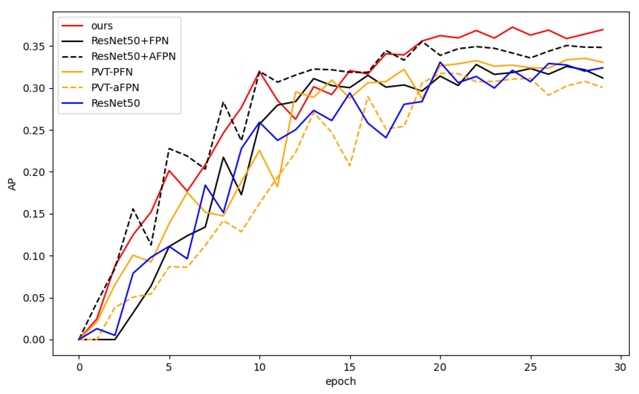 21], and PVT with AFPN (PVT+AFPN). Furthermore, to position our approach within the broader landscape of contemporary detection methods, we include the Detection Transformer (DETR) [
